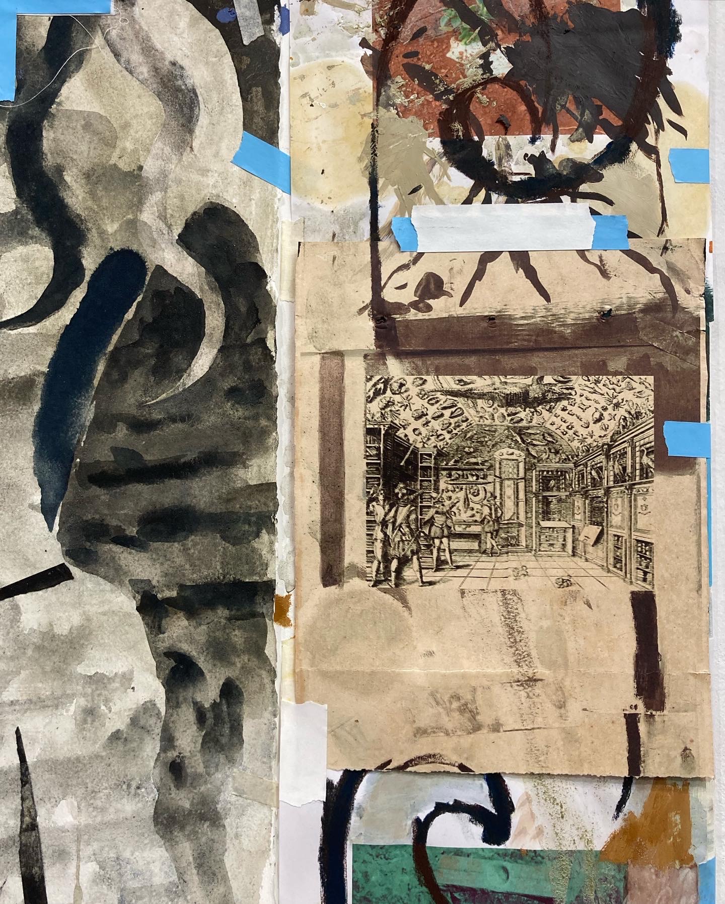 Manuscript of Spectral Debris, oil, acrylic, watercolor, inkjet, paper, and tape on canvas, 50x40”, 2025